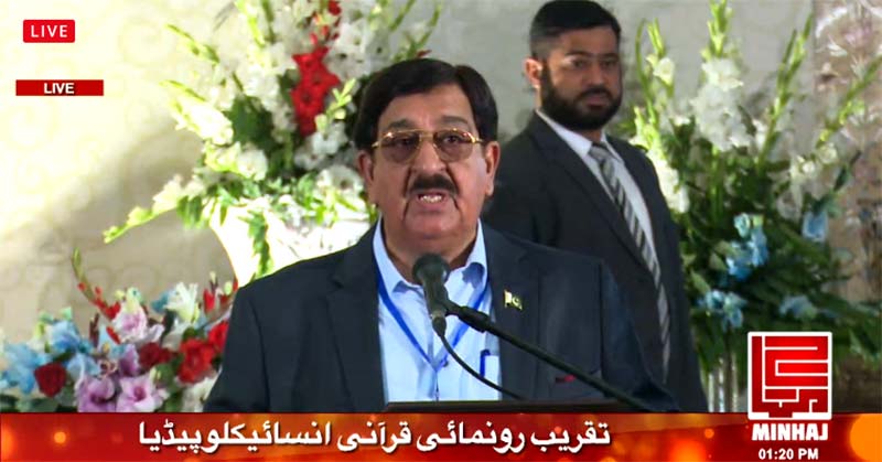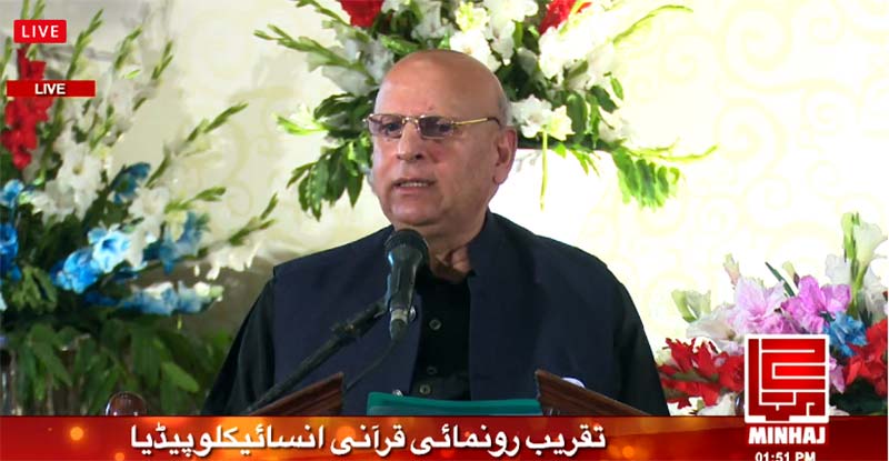 Punjab Governor Ch. Muhammad Sarwar started his speech by congratulating Dr Tahir-ul-Qadri on writing a massive work in the form of the Quranic Encyclopedia. He termed it as a great service to Pakistan, humanity and Islam. He said that he is sure that by reading the Encyclopedia, one will get a lot of facilitation in understanding the meaning of the Holy Quran and the divine message based on love and peace will spread around the world. He said that whosoever studies the Holy Quran with sincerity can neither go astray nor become an extremist.